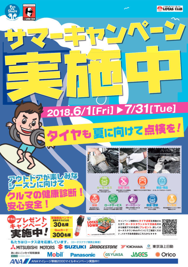 ロータスサマーキャンペーン実施!! 2018/06/01 お知らせキャンペーン 6月1日(金)より7月31日(火)までサマーキャンペーン実施中です。 お近くのロータス店でクルマの健康診断はいかがですか。 期間中にタイヤ点検をされたお客様には、抽選でプレゼントあります。 お出かけ前にぜひともお寄りください。